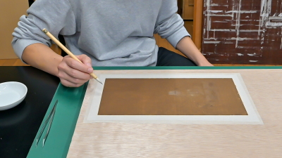 まず、にかわで顔彩の剥落部分を押さえ定着させ、表打ちを行ないます。